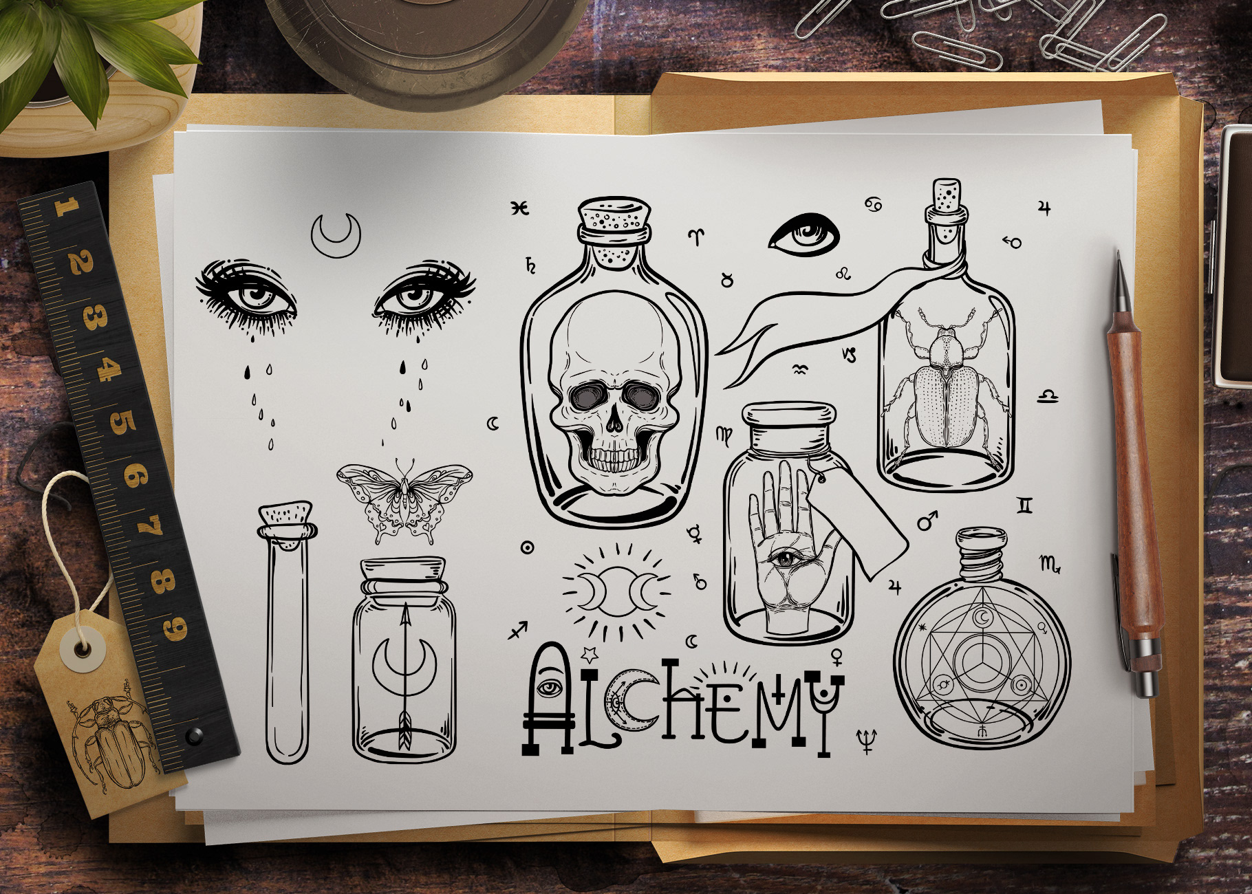 My new set of black and white hand drawn highly detailed vector illustrations collection with mystic and occult signs is full of mystery. It takes you to the other worlds full of magical stories of spirituality, occultism, chemistry.