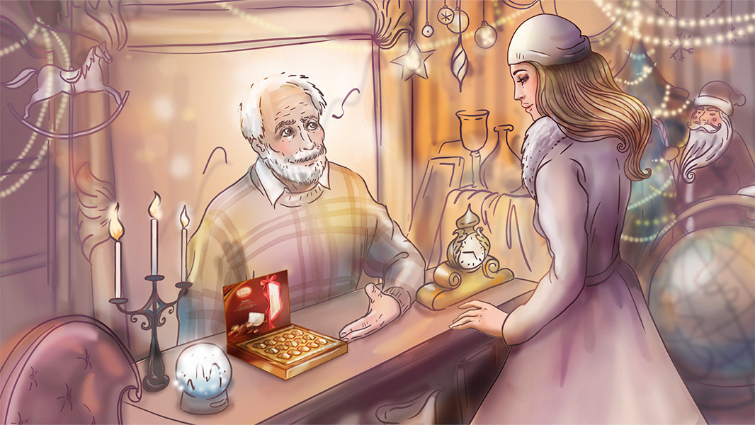 This storyboard captures the warm and nostalgic atmosphere of the holiday season in a European city. The protagonist, wrapped in elegant winter attire, strolls through a charming cobblestone street adorned with twinkling fairy lights and festive decorations. She enters a small antique shop, enchanted by the treasures within—each piece whispering a story from the past.
