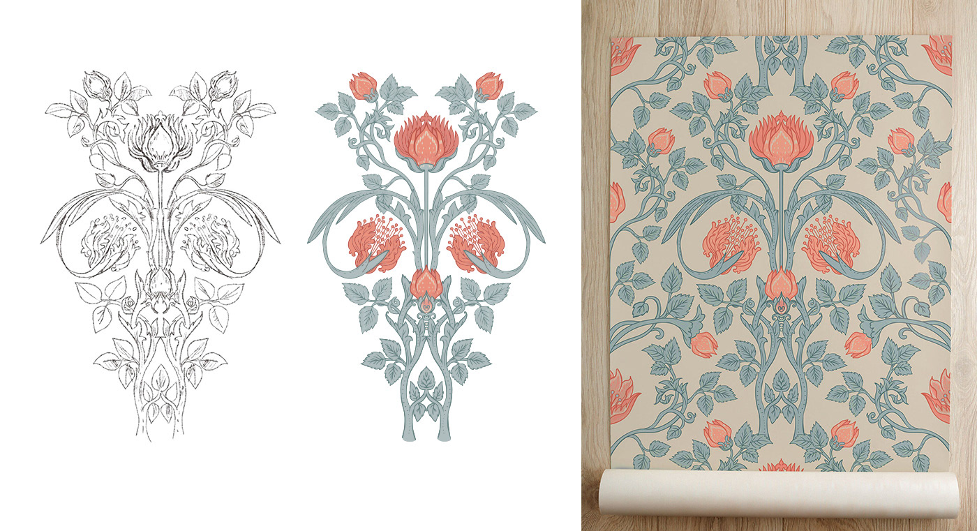 This project showcases the journey of Tulip Garden, a pattern inspired by the timeless elegance of the Arts and Crafts movement and classic English ornamentation.