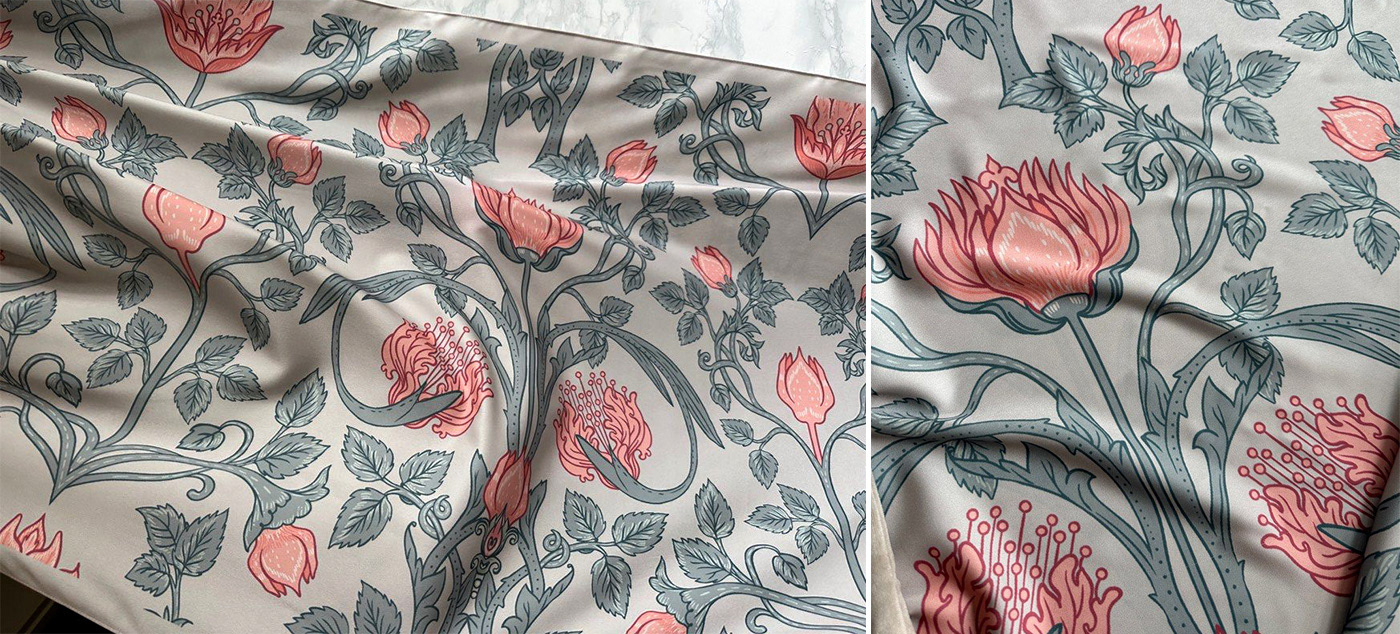 Pattern Tulip Garden printed on silk fabric. Closeup